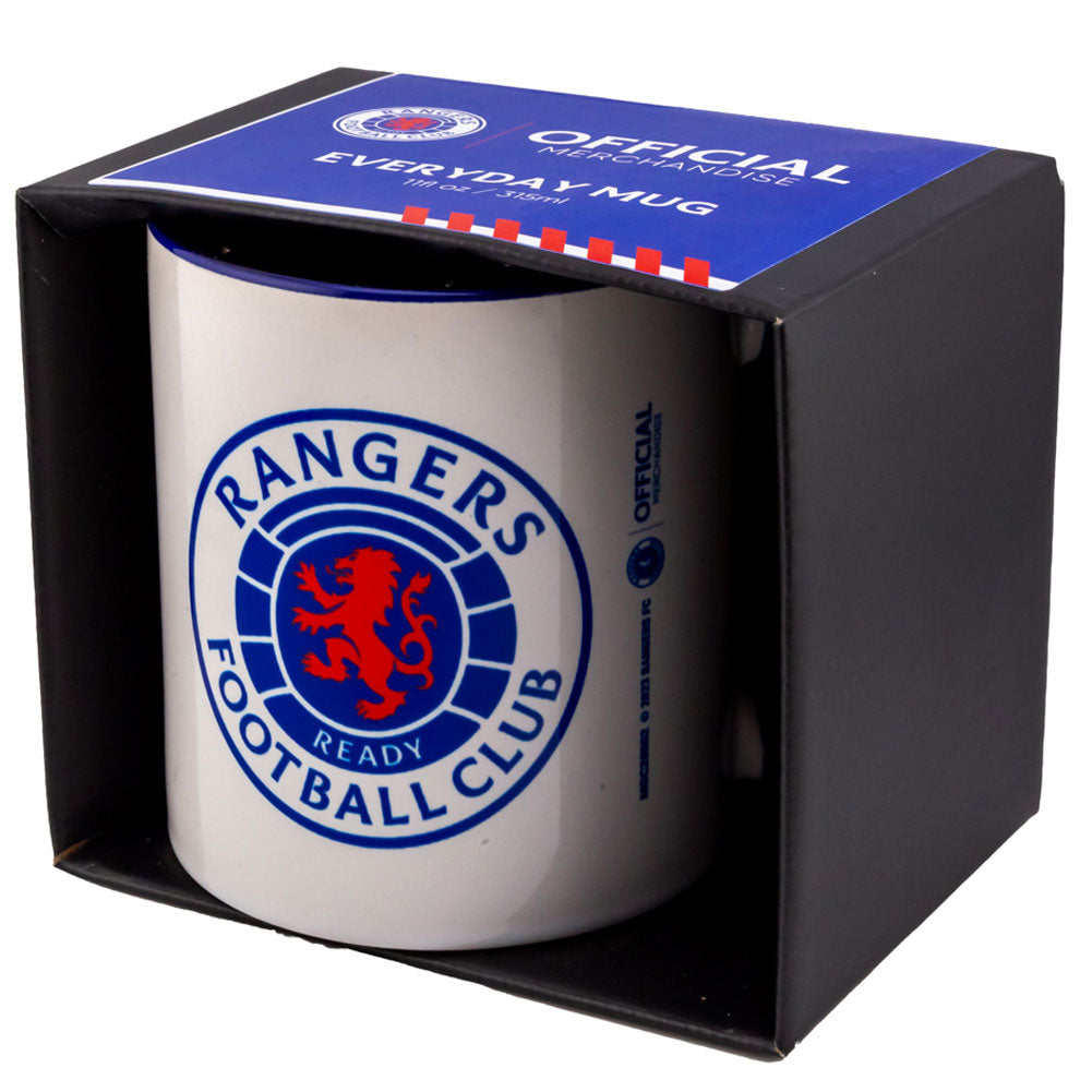 Ceramic everyday coffee mug, Features the Rangers logo on a white background with a blue inner, Glazed kiln fired finish with full colour handle, Official licensed product, Approx 315ml (11oz), Approx 9cm tall, 8cm in diameter.